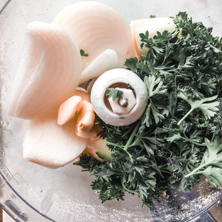 1. Place oven to 450 F. Then, place the white or red onion, garlic, lemon juice and parsley in a food processor until liquid consistency.